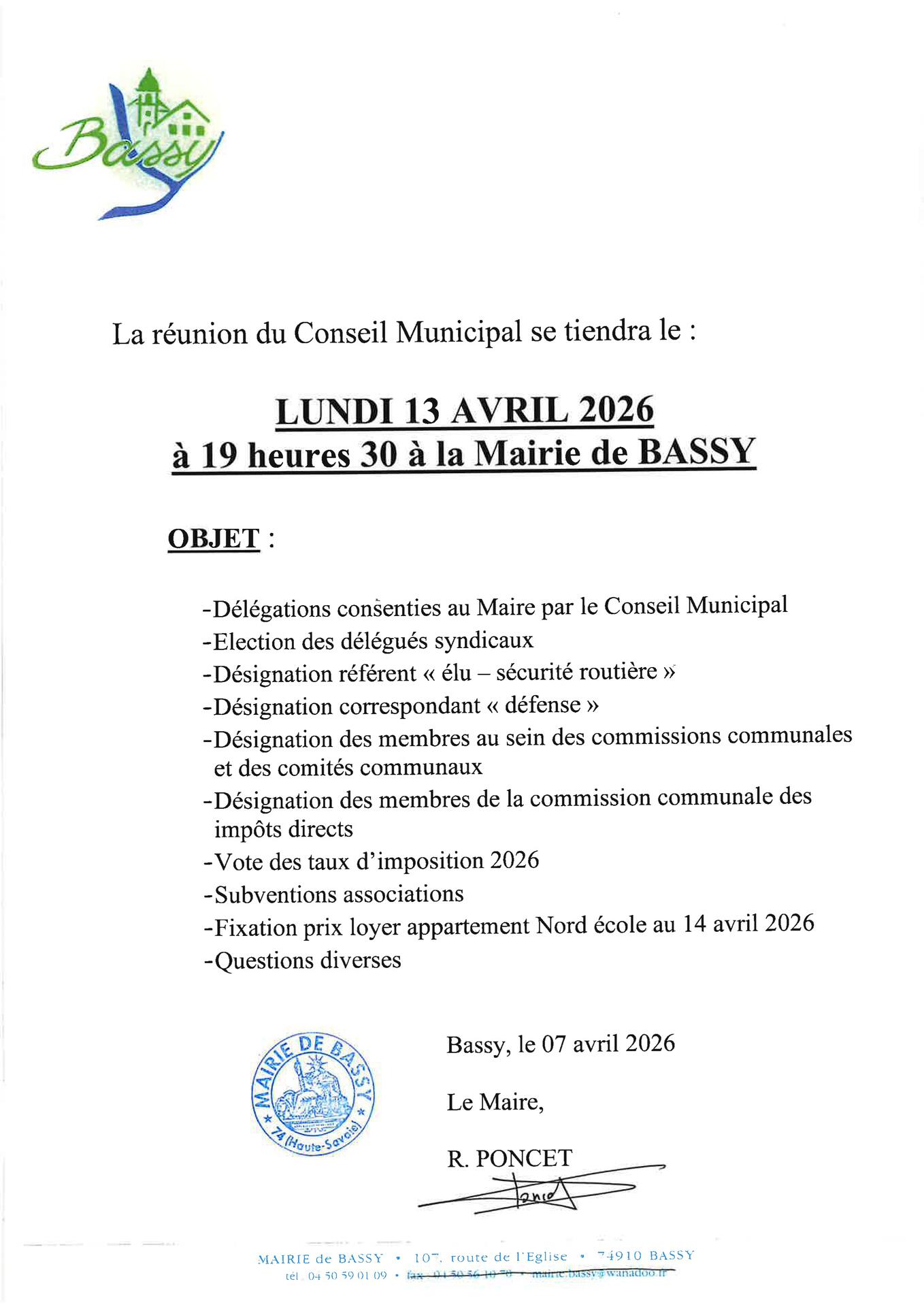 La prochaine réunion du Conseil municipal est fixée au lundi 13 avril 2026 à 19h30.