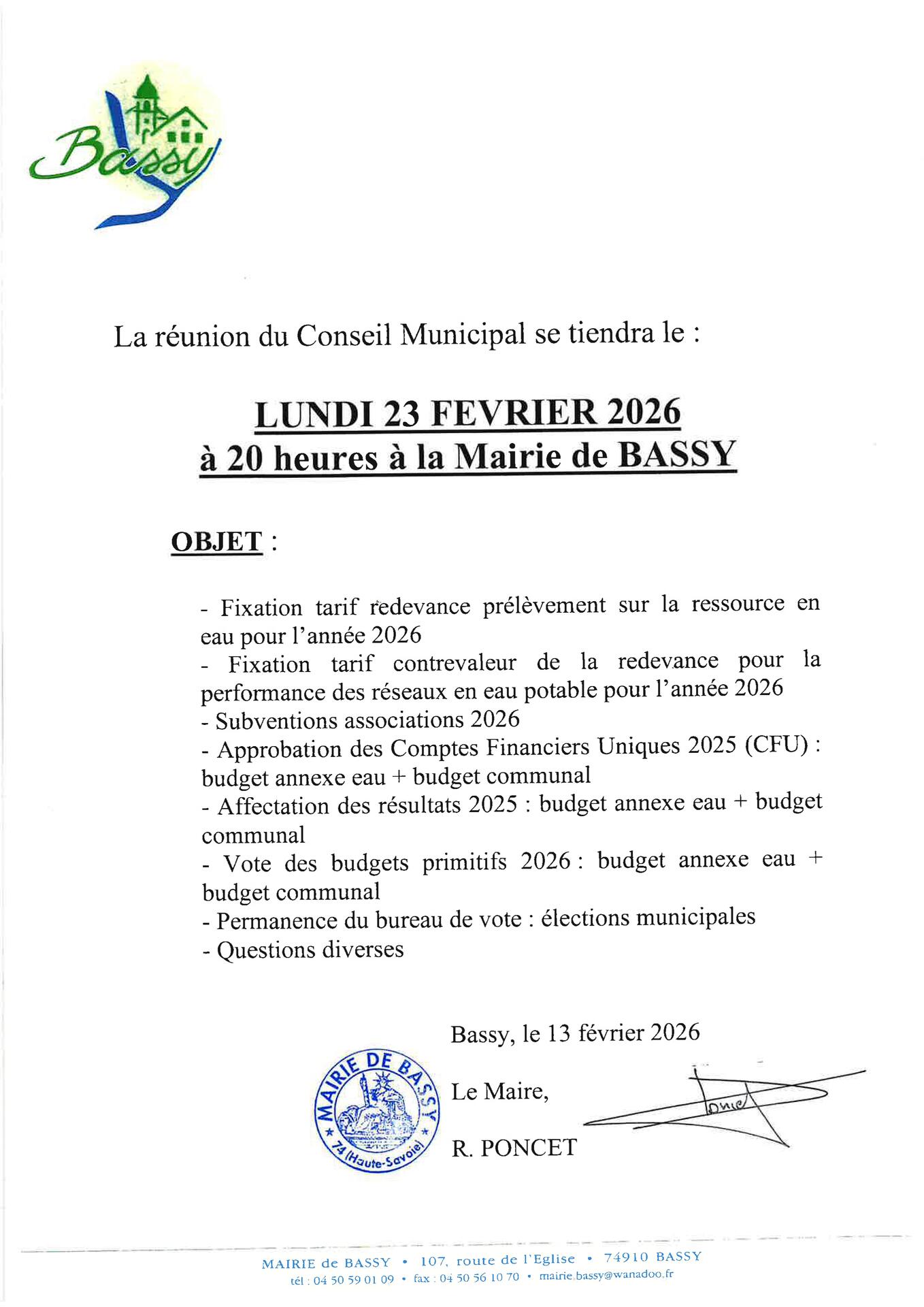 Prochaine réunion du Conseil municipal le 23 février