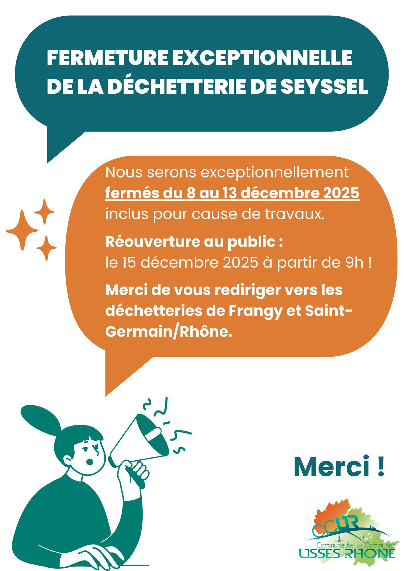 La déchetterie de Seyssel sera exceptionnellement fermée du 8 au 13 décembre 2025 inclus pour cause de travaux.