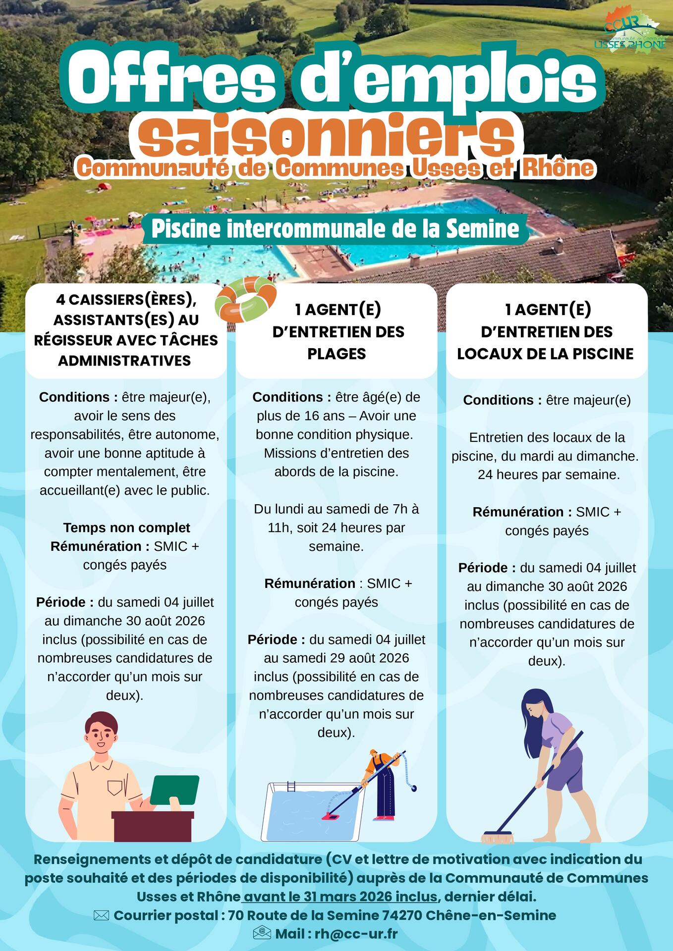 Dépôt de candidature (CV et lettre de motivation avec indication du poste souhaité et des périodes de disponibilité) auprès de la CC Usses et Rhône avant le 31 mars 2025 dernier délai :