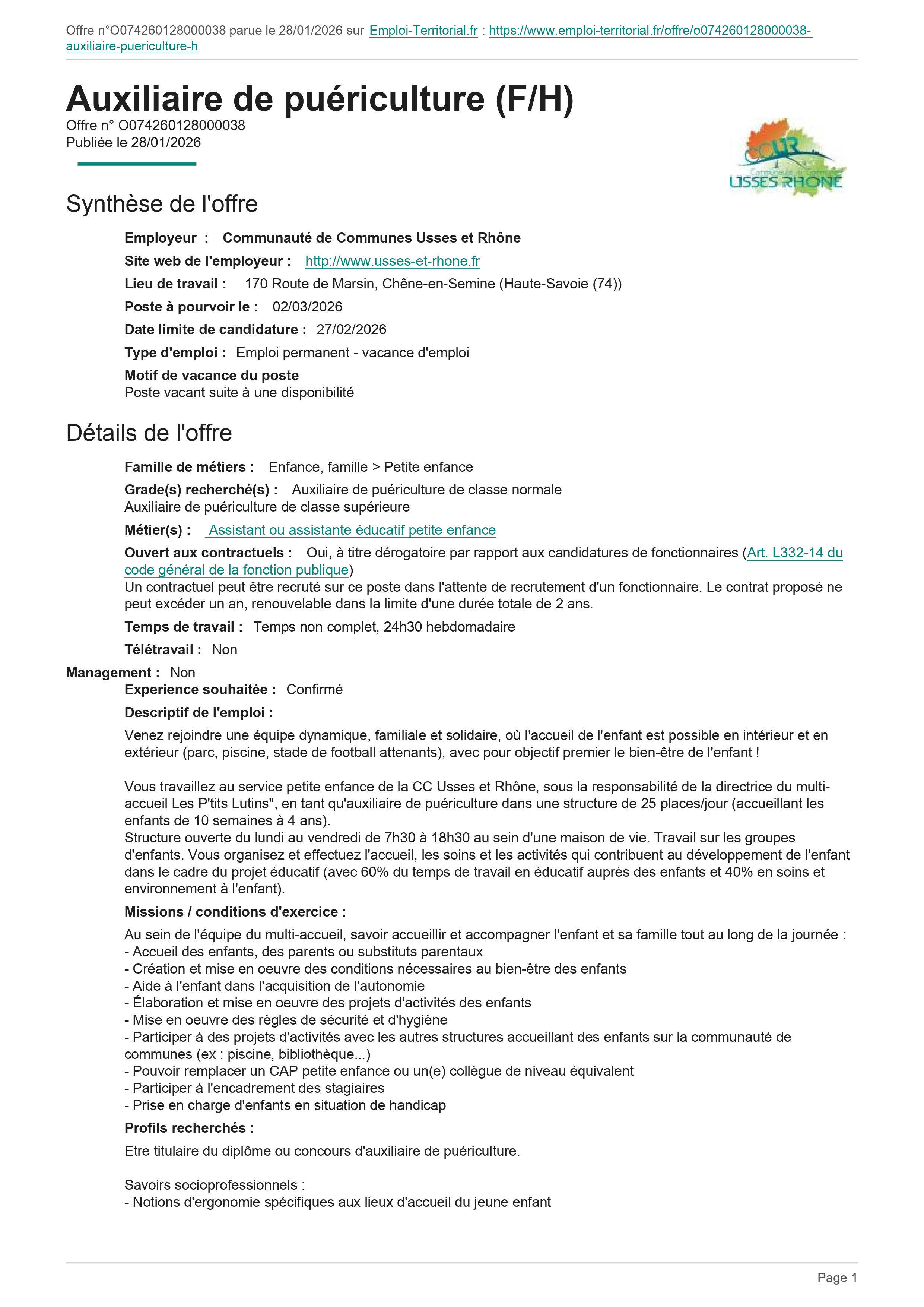 La CCUR recrute un(e) auxiliaire de puériculture dans une structure de 25 places/jour (accueillant les enfants de 10 semaines à 4 ans).