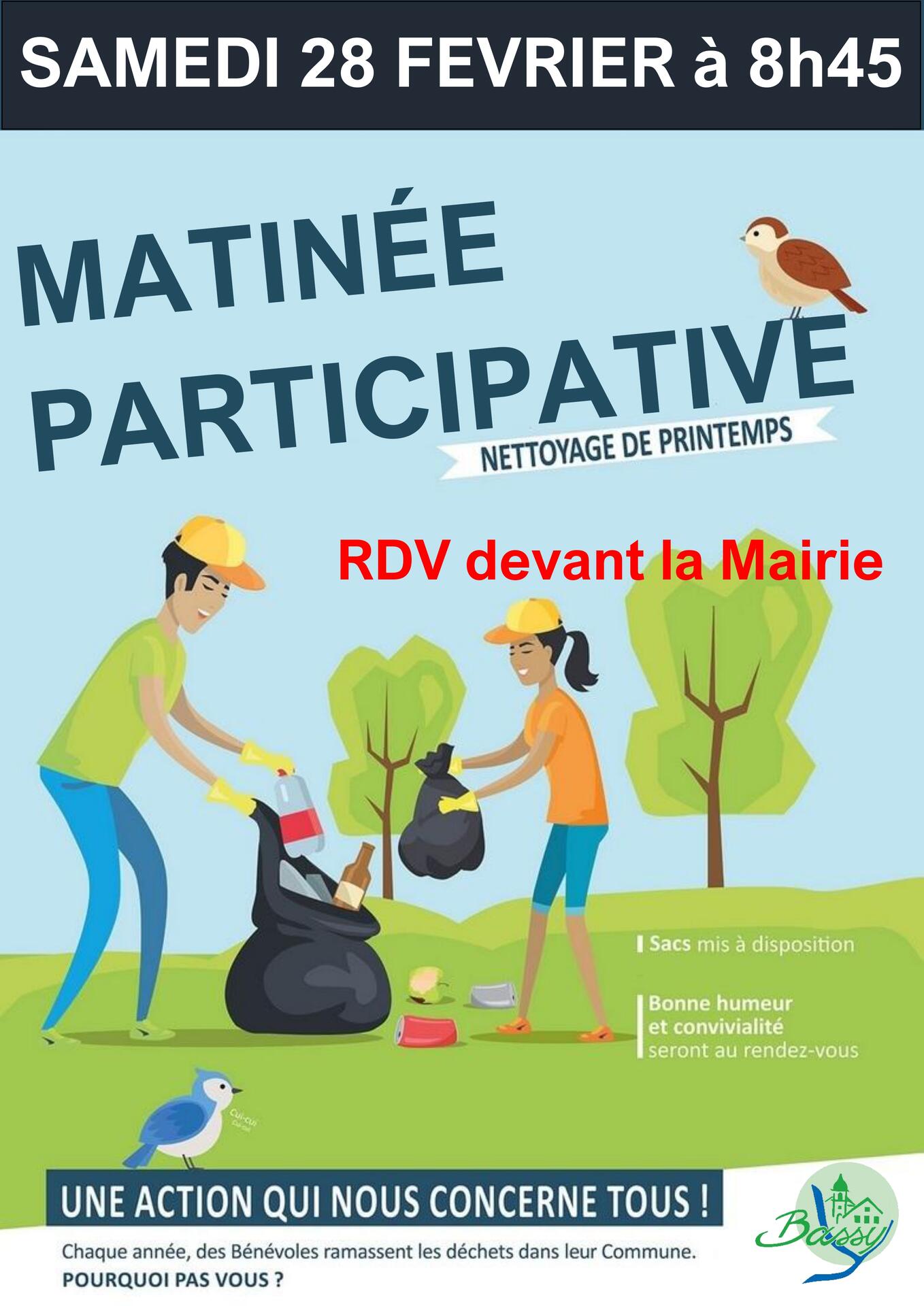 La traditionnelle matinée participative de nettoyage des routes et chemins communaux aura lieu le samedi 28 février à partir de 8h45 à la Mairie.