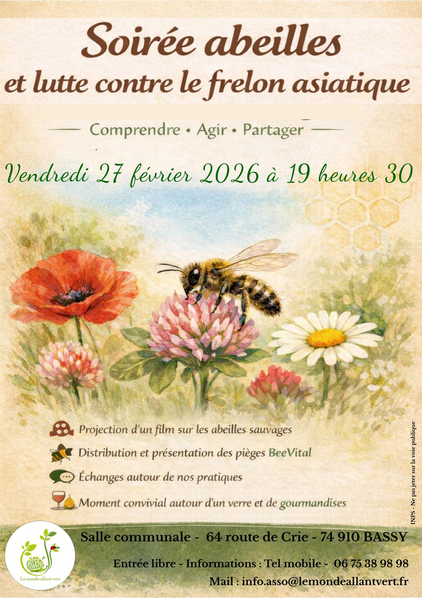 Le Monde allant vert organise une soirée pour mieux comprendre les enjeux autour des abeilles et du frelon asiatique le vendredi 27 février à partir de 19h30 à la salle communale – 64 route de Crie.
