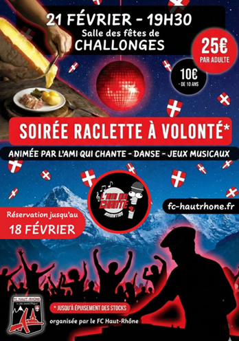 Le Football Club du Haut Rhône organise une soirée "Raclette à volonté" à la salle des fêtes de Challonges le samedi 21 février 2026.
