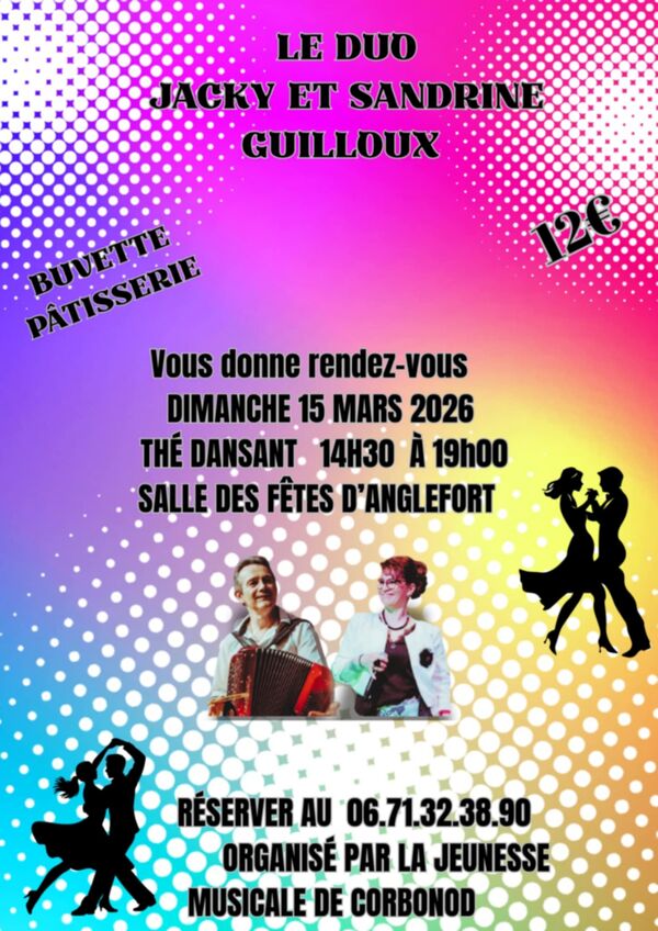 La Jeunesse Musicale de Corbonod organise son 1er thé dansant, avec le duo Jacky et Sandrine Guilloux, à la salle des fêtes d'Anglefort le dimanche 15 mars, de 14h30 à 19h00.